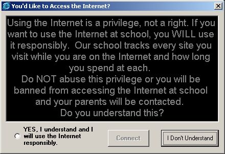 If they click on the agreement at the bottom of the screen then click the Connect button, they will be granted access to the Internet and the Internet Explorer browser will load and display your default start-up page as set in the preferences (actually, the default Internet browser will load, so if your school uses Netscape Communicator instead of Internet Explorer, then that browser will load). If they click the "I Don't Understand" button, the Launcher will close and they will be returned to the Desktop.